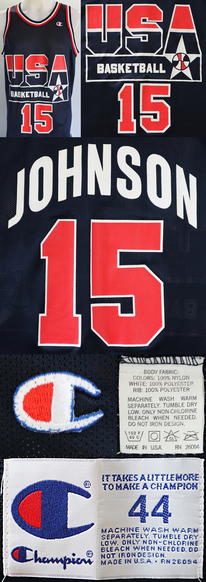 เสื้อบาส REPLICA แบบสกรีน ของแท้ ยี่ห้อ Champion made in U.S.A. ทีม USA BASKETBALL ของ Magic Johnson #15 ไซส์ L ความกว้างของเสื้อ 21" รอบอกไม่เกิน 42" ไหล่กว้าง 13" ความยาวเสื้อจากไหล่-ชายเสื้อ 31" เนื้อผ้า POLYESTER 100% ผ้าระบายอากาศดี